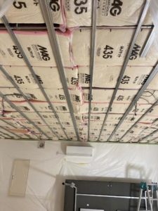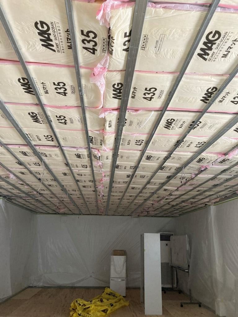 昨日で1階の床面が出来ましたので、本日は1階天井に断熱材を敷設していきます。