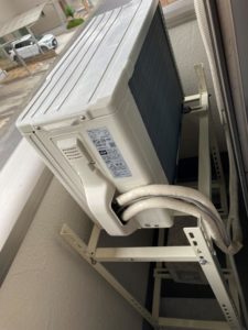 ベランダが狭くて効きの悪いエアコンの室外機を2段架台に設置する工事になります。