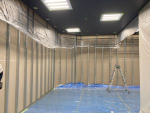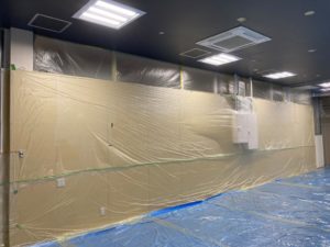 残置の床面や壁面、ファサードなどをしっかり養生しました。