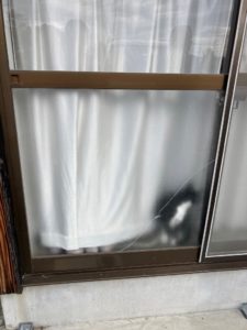 飛び石で掃出し窓のガラスがひび割れています。