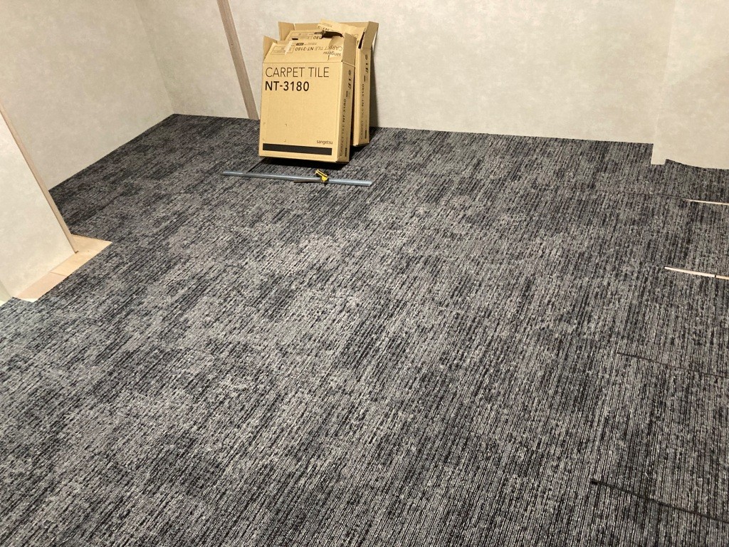 明日も引き続き、残りの部屋のタイルカーペット敷設とルームエアコンを行っていきます。