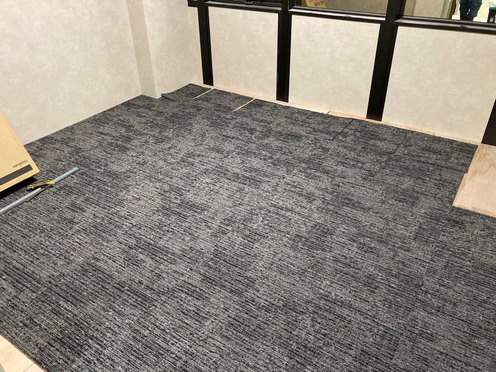本日も昨日に引き続き、タイルカーペットの敷設とエアコン設置を行っていきます。