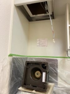 新しい換気扇の□が少しだけ既設に比べ大きいのですが、何とか開口せずに入りました(^^;