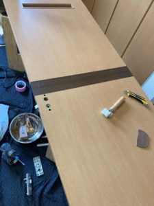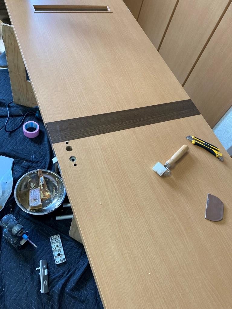 一旦ドアを外して、穴が隠れるようにリフォームシートを貼り付けています。