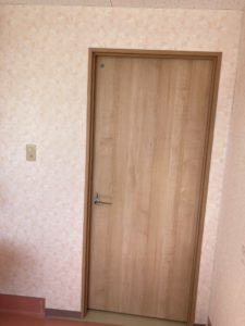 3階トイレ壁面のクロス貼り完了。ついでにドアも設置しました。