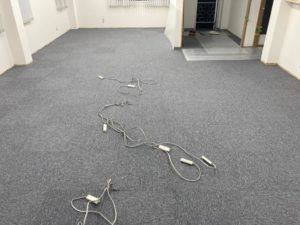 先日半面敷設したタイルカーペットを、内装工事に備えて全面敷設します。