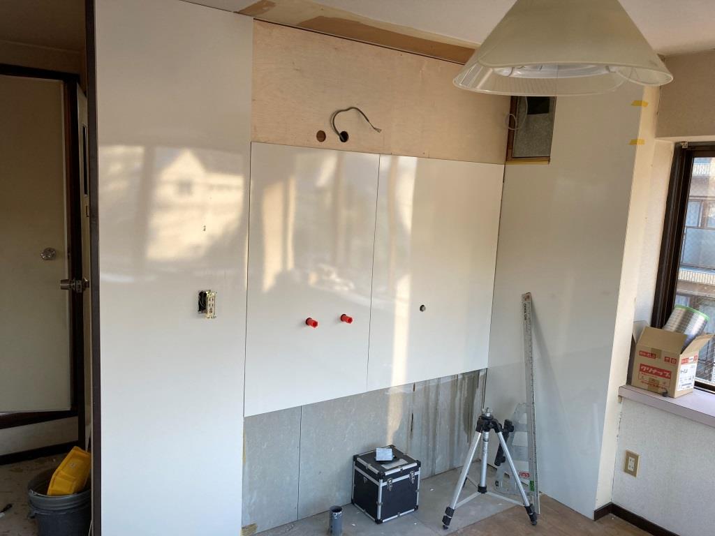 午後からは旧キッチンのタイル面にキッチンパネルを貼る工事を行いました。