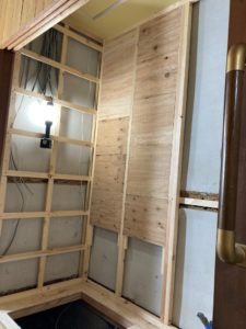 本日は壁面下地の造作と、可動棚設置用の補強下地入れを行いました。