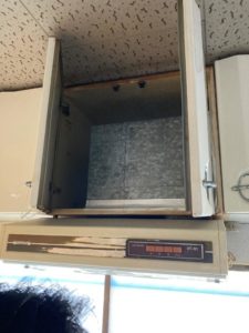 既設の平型レンジフードからシロッコファンへ交換していきます。