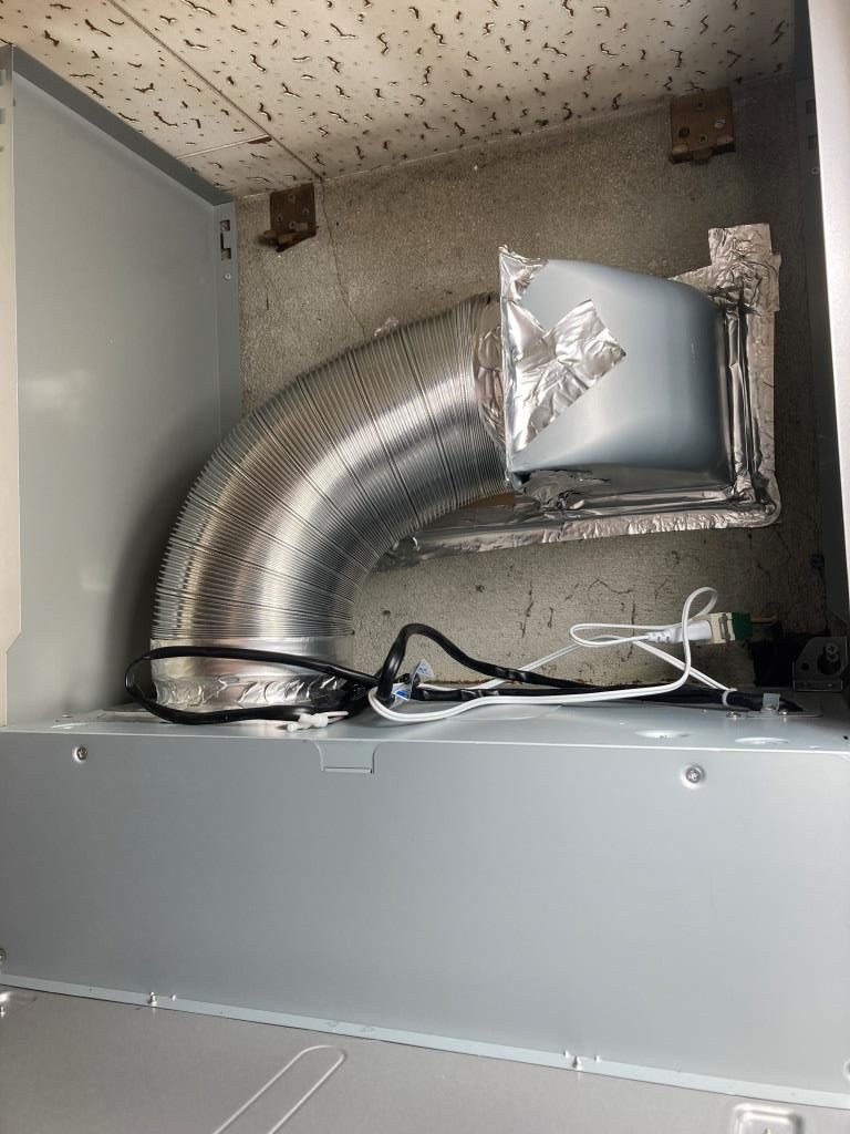 ダクトによる排気をどうするか考え、様々な部材を使用して何とか排気しています。