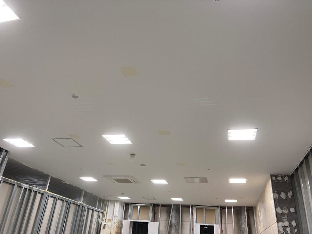 天井に関してはダウンライトなどの開口を閉塞した後、パテ埋めしています。