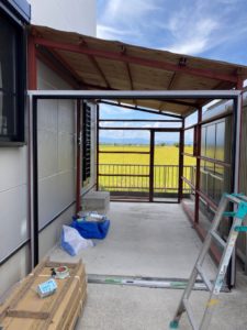 サッシの障子が入りました。シルバーと黒で落ち着いた外観です(^^♪