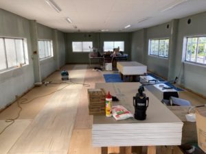 まずは床面の補強のため、合板を敷き詰めていきます